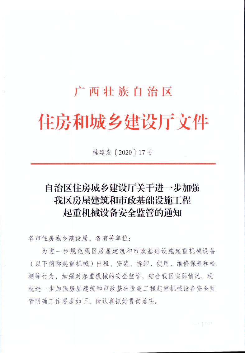 自治區(qū)住房城鄉(xiāng)建設(shè)廳關(guān)于進(jìn)一步加強(qiáng)我區(qū)房屋建筑和市政基礎(chǔ)設(shè)施工程起重機(jī)械設(shè)備安全監(jiān)管的通知— —桂建發(fā)〔2020〕17號