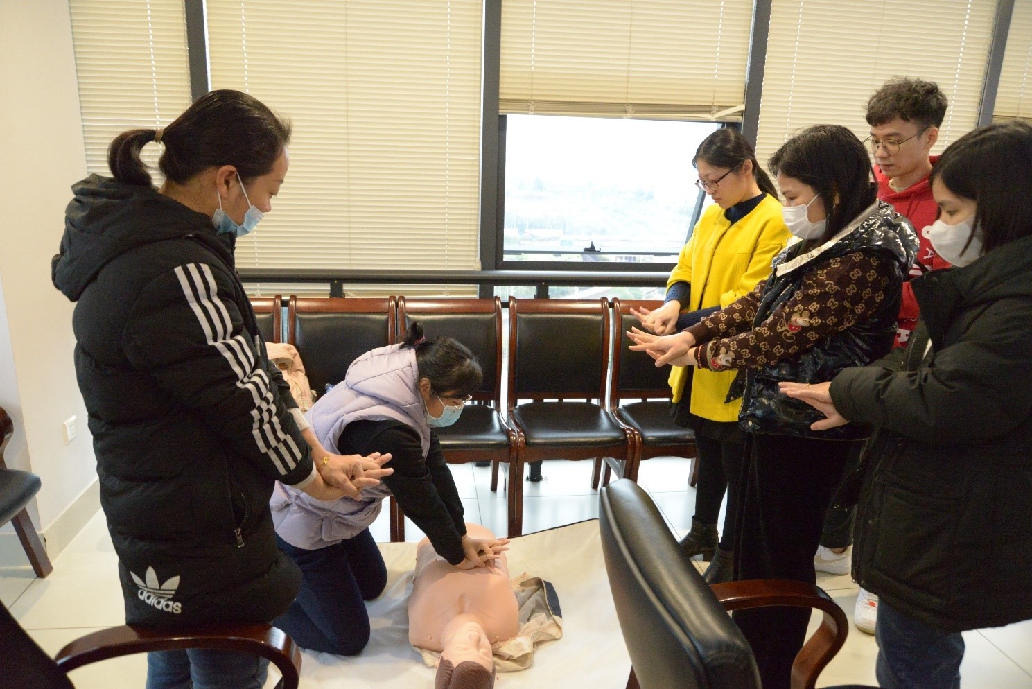 培訓(xùn)老師專業(yè)的講解和專業(yè)的救護(hù)技術(shù)深深地吸引了在場的每一位學(xué)員,大家在培訓(xùn)老師“一對(duì)一”指導(dǎo)下學(xué)習(xí)心肺復(fù)蘇的輪流實(shí)操。老師們耐心地提示要點(diǎn),糾正錯(cuò)誤動(dòng)作,確保學(xué)員們的每個(gè)動(dòng)作做到標(biāo)準(zhǔn)、到位。通過理論講解輔導(dǎo)和“沉浸式”實(shí)操演練,學(xué)員們更全面、深入地領(lǐng)會(huì)了應(yīng)急救護(hù)的知識(shí)要領(lǐng)和實(shí)操技巧。