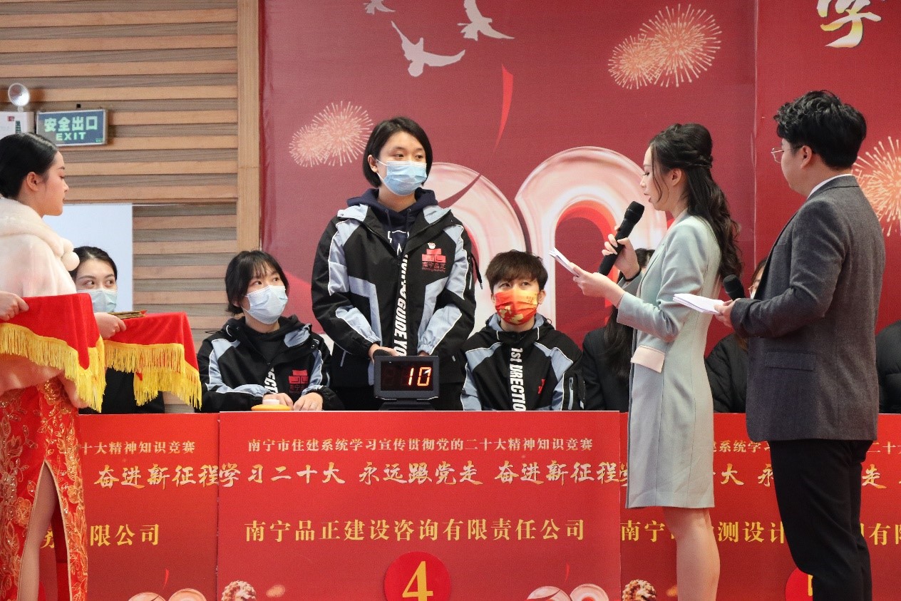 為深入宣傳貫徹黨的二十大精神,全面貫徹落實(shí)習(xí)近平總書記在大會(huì)期間的重要講話,深刻領(lǐng)悟“兩個(gè)確立”的決定性意義,增加“四個(gè)意識(shí)”、堅(jiān)定“四個(gè)自信”、做到“兩個(gè)維護(hù)”,引導(dǎo)廣大干部群眾認(rèn)真學(xué)習(xí)領(lǐng)悟黨的二十大提出的新思想、新部署、新要求,通過以賽促學(xué),以賽促用,營造濃厚學(xué)習(xí)氛圍。2023年1月5日、6日,黨員何卉芷、入黨積極分子張藝梅、青年代表覃夏代表品正黨支部參加了由南寧市住建設(shè)行業(yè)黨委舉辦的“學(xué)習(xí)宣傳貫徹黨的二十大精神”知識(shí)競賽。取得了第三名的好成績。