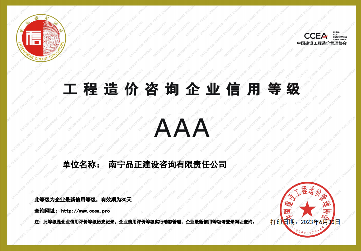 2023年3月至6月,南寧品正建設咨詢有限責任公司參加中國建設工程造價管理協(xié)會組織的2023年第一批工程造價咨詢企業(yè)信用評價,順利通過初評、終評,榮獲中國建設工程造價管理協(xié)會最高等級AAA級信用等級(中價協(xié)〔2023〕40號文),我公司自2017年以來,已經(jīng)連續(xù)6年獲此殊榮。