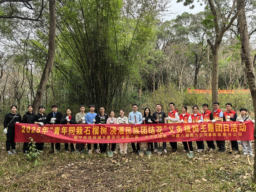 為深入貫徹落實黨的二十屆三中全會精神,提高廣大團(tuán)員青年愛護(hù)自然、保護(hù)環(huán)境的意識,2025年3月13日,由共青團(tuán)南寧市住房城鄉(xiāng)建設(shè)行業(yè)工作委員會和共青團(tuán)南寧市興寧區(qū)委員會共同主辦,中國建筑第八工程局有限公司南方公司基礎(chǔ)設(shè)施分公司承辦的“青年同栽石榴樹 澆灌民族團(tuán)結(jié)花”植樹主題團(tuán)日活動在南寧市獅山公園順利開展。公司團(tuán)委書記劉媛佳、青年團(tuán)干覃夏參加了此次活動。