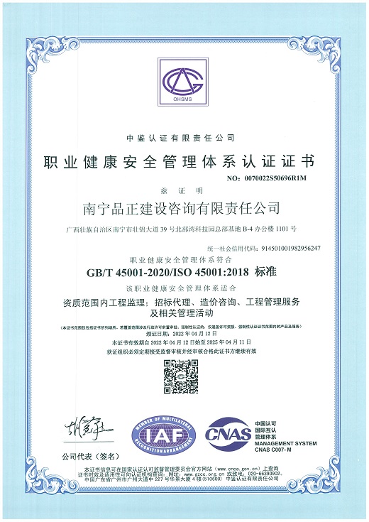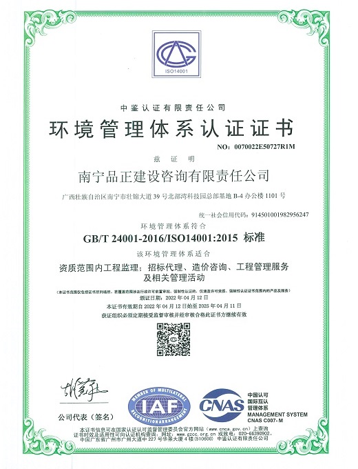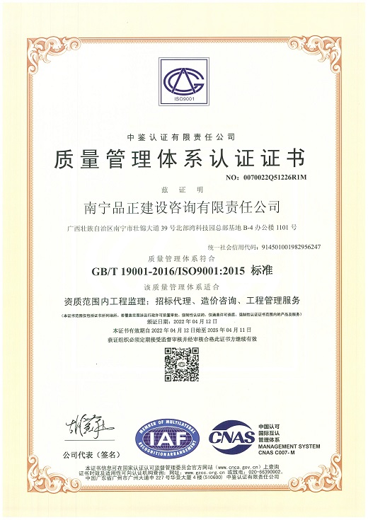 南寧品正于2000年通過ISO9001:2000質(zhì)量體系認(rèn)證,2009年改版為ISO9001:2008并通過認(rèn)證;2016年5月同時(shí)通過GB/T19001-2008質(zhì)量管理體系、GB/T28001-2001職業(yè)健康安全管理體系認(rèn)證和GB/T24001-2004環(huán)境管理體系三體系認(rèn)證。公司長期重視管理體系認(rèn)證與實(shí)際工作的結(jié)合,制定行之有效的檢查及內(nèi)審程序文件,形成了完整的《管理手冊(cè)》、《程序文件》、《標(biāo)準(zhǔn)作業(yè)指導(dǎo)書》三個(gè)層次的質(zhì)量體系文件。每年定期進(jìn)行工作質(zhì)量檢查、質(zhì)量體系內(nèi)審和管理評(píng)審,確保公司整體質(zhì)量、環(huán)境和職業(yè)健康安全工作的有效性、持續(xù)性,達(dá)到規(guī)范化和標(biāo)準(zhǔn)化。